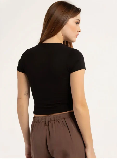 The soft v-neckline, short regular sleeves, and cropped length create a modern yet timeless look, ideal for casual outings, layering, or pairing with high-waisted bottoms.